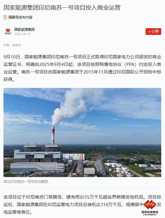 9月10日,国家能源集团印尼南苏一号项目正式取得印尼国家电力公司颁发的商业运营证书,明确自2025年9月4日起,该项目按照购售电协议(PPA)约定投入商业运营。南苏一号项目由国家能源集团于2015年11月通过印尼国际公开招标中标获得。