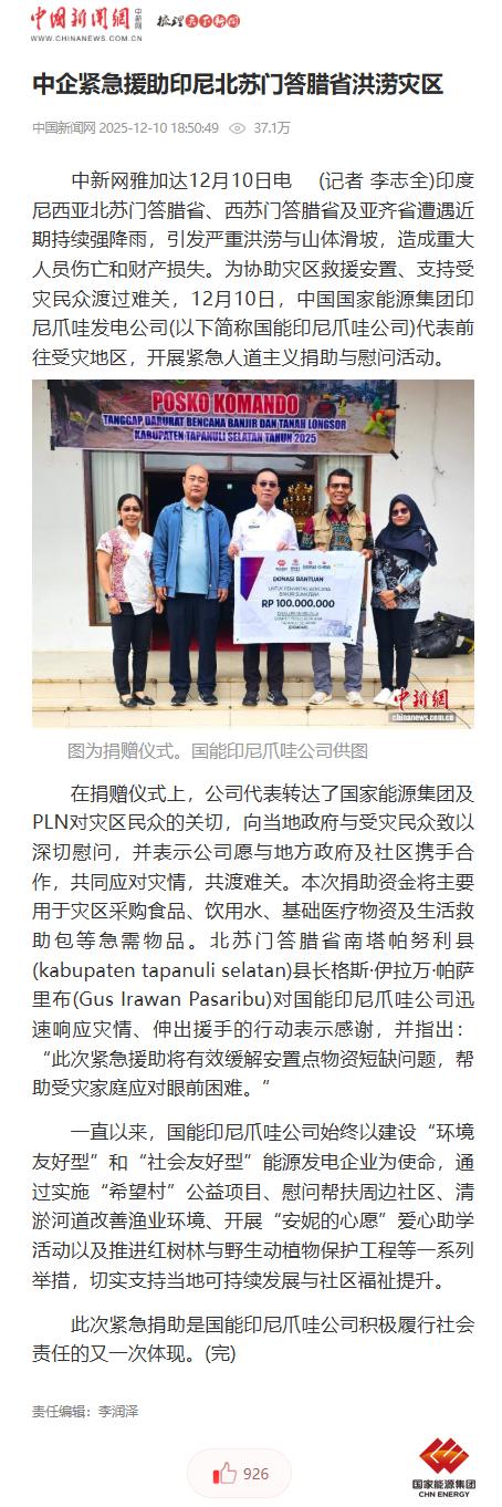 此次紧急捐助是国能印尼爪哇公司积极履行社会责任的又一次体现。