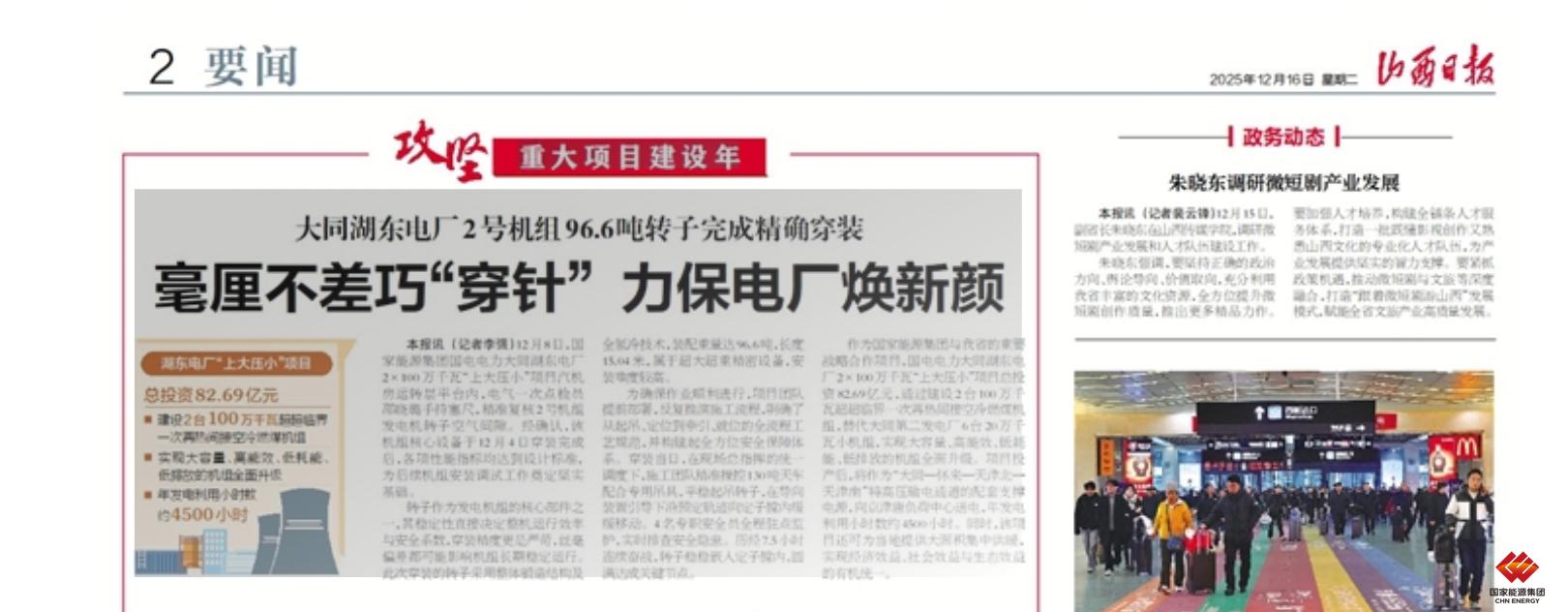 山西日报:大同湖东电厂2号机组96.6吨转子完成精确穿装