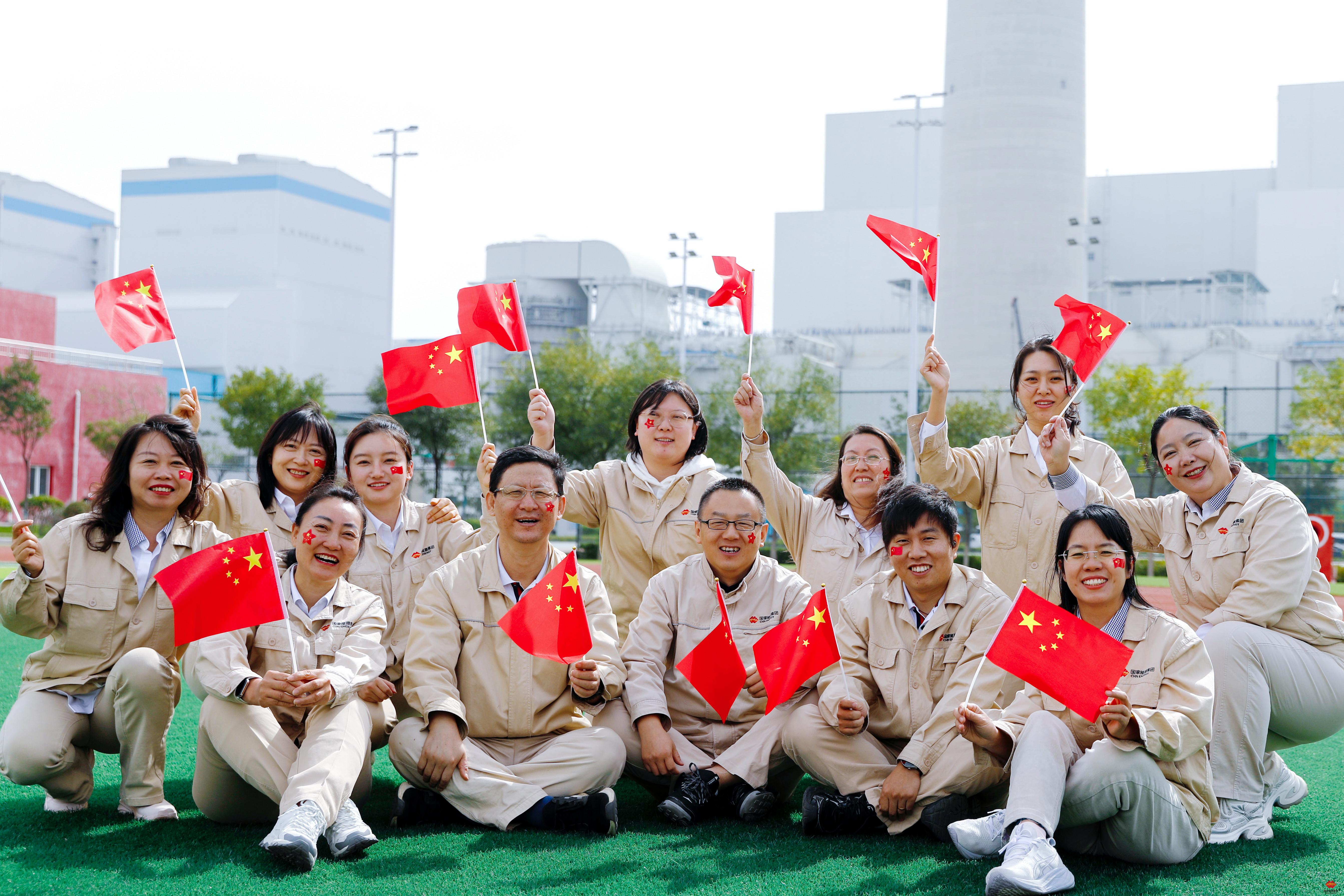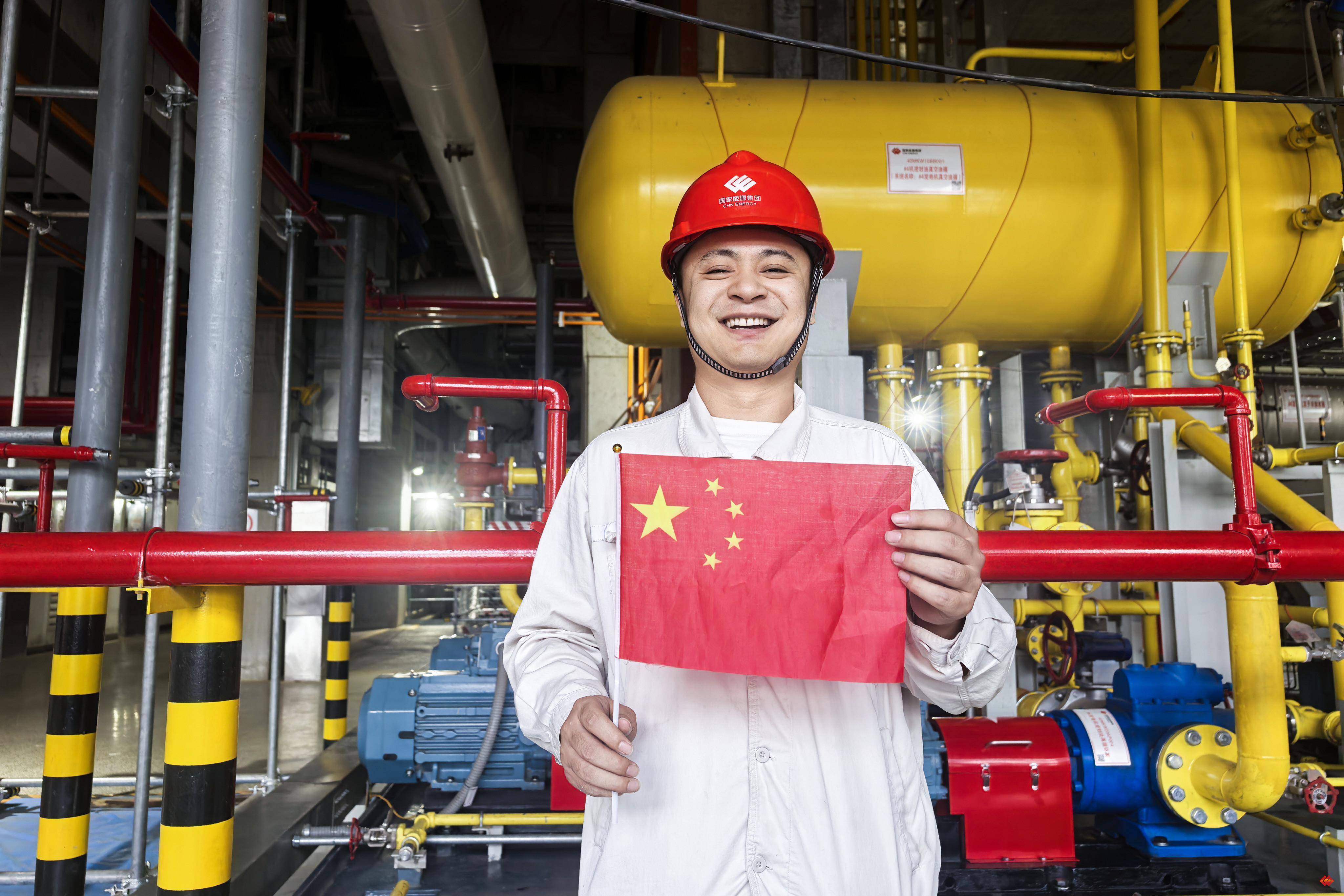 9月26日,国能京燃热电员工在首都能源保供现场,高举国旗深情深情表达祝福。身后是“燃气-蒸汽”联合循环机组向首都电网输送清洁能源,面前是五星红旗熠熠生辉,这是电力生产者用实际行动描绘的国庆、中秋“双节”首都能源保供壮丽画卷。陆雷 摄