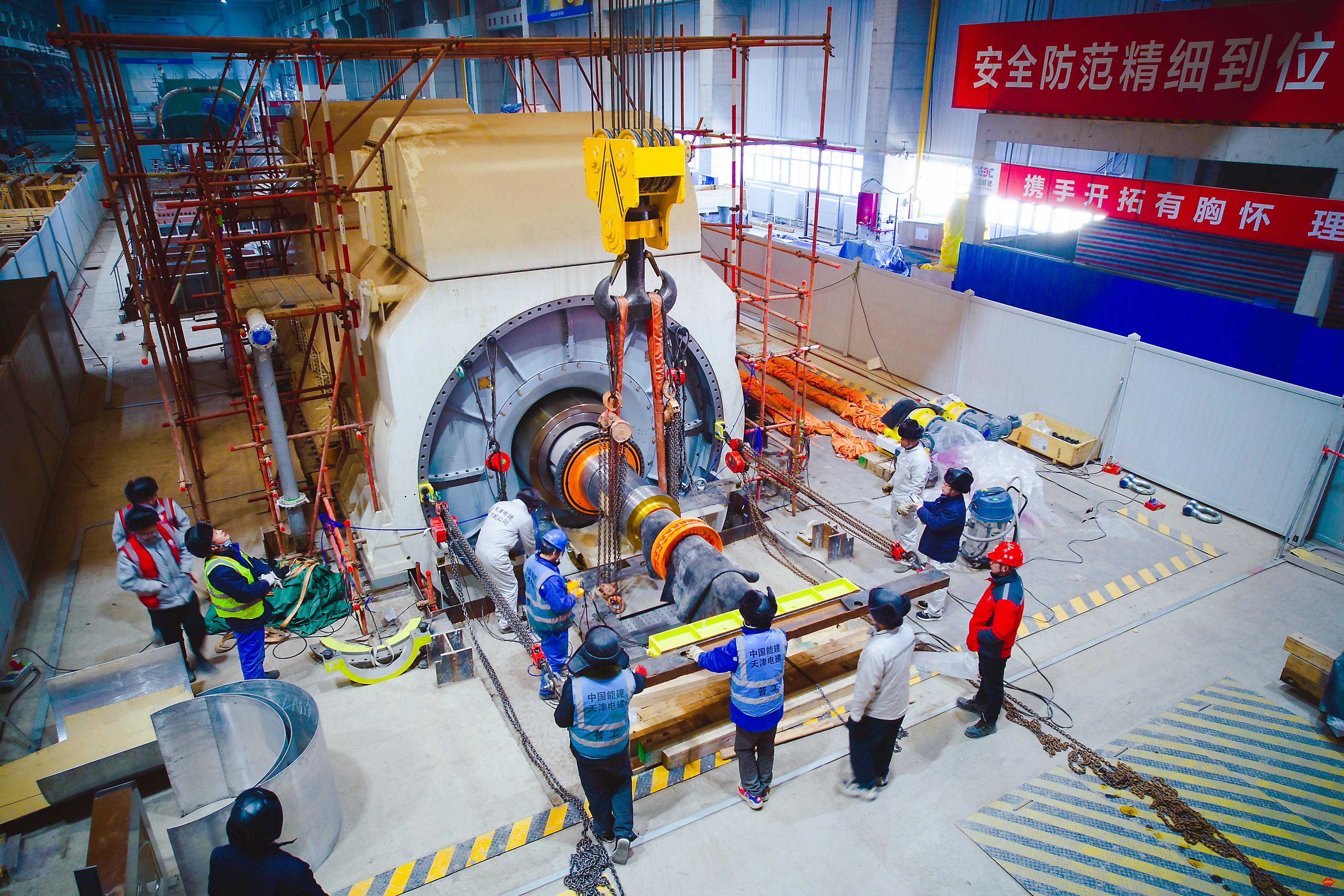 图为2号机组发电机转子穿装现场。该转子装配重量达96.6吨,长度15042.7毫米,属于超大超重精密设备,穿装施工技术要求高、安全风险大。项目团队提前谋划、精心部署,制定详尽施工方案与规范工艺流程,全力保障作业万无一失。