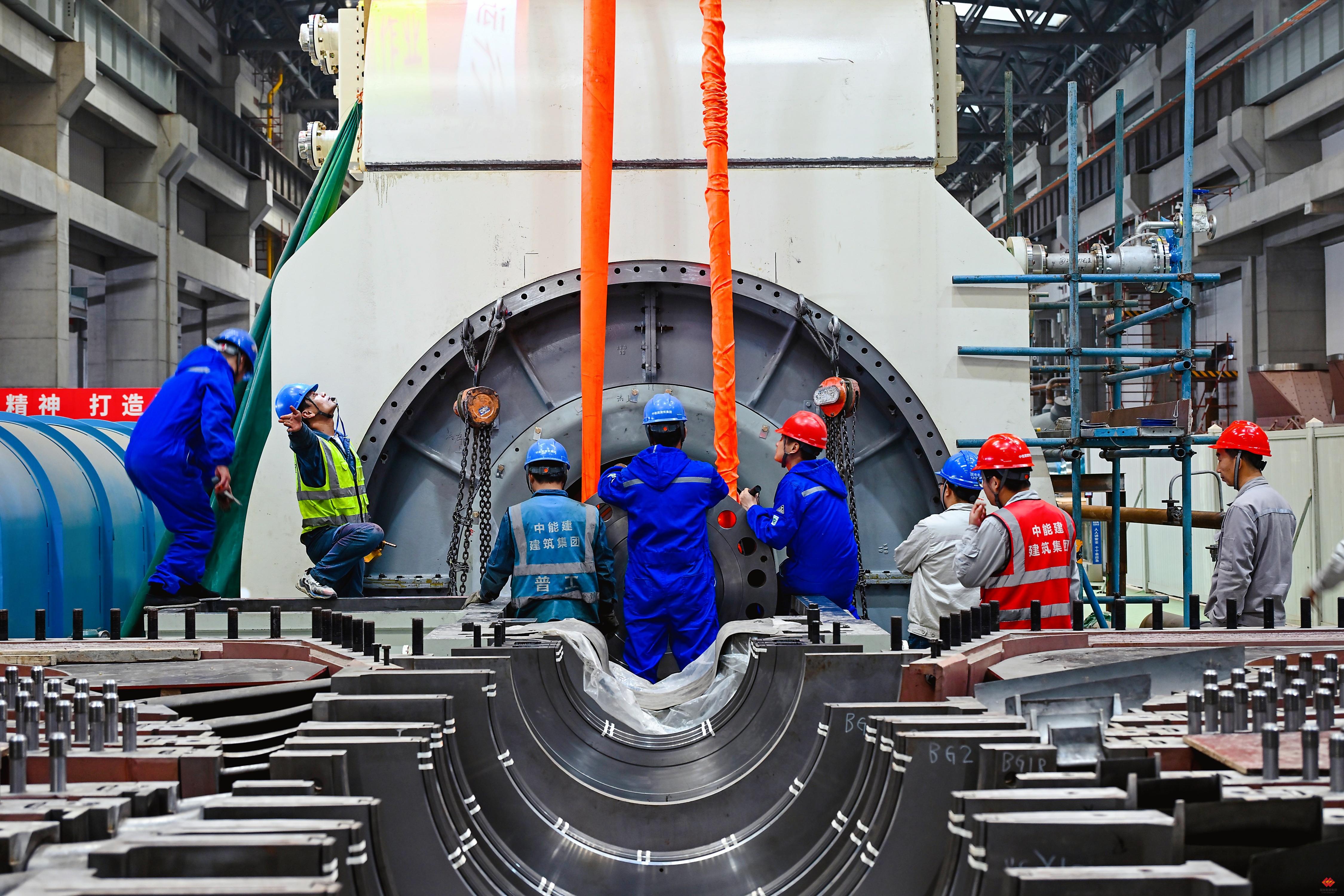 图为吊装1号机组汽轮机??鄹鬃饕底魑谓忧捌诎沧坝牒笃诘魇缘暮诵墓丶方冢涫┕ぞ扔胫柿恐苯佑跋旎槌て诎踩榷ㄔ诵兴郊澳苄Х⒒?。施工团队实行全程旁站监督,精准控制吊点位置、起吊速度,实时监测汽缸四角高度差,确保偏差严格控制在2毫米以内。