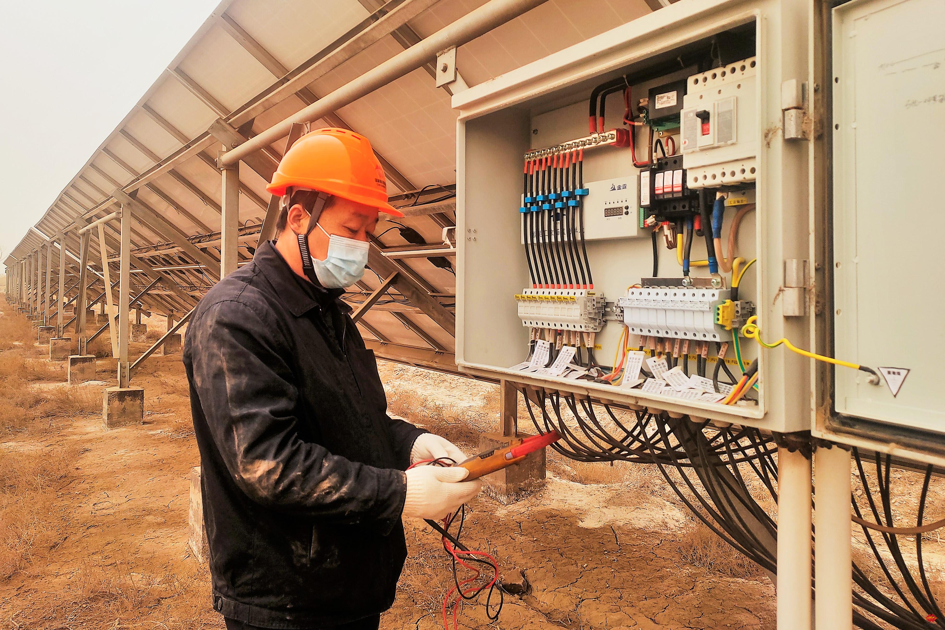 图为该公司宣和光伏电站运维人员在大风沙尘天气排查汇流箱。沙尘暴突袭,该公司及时启动大风沙尘极端天气专项应急方案,成立了巡查小组加密巡检频次,实时跟踪设备运行数据,抢修人员24小时驻场待命,确保在突发故障时能够实现快速处置,将损失降到最低。周艳 摄